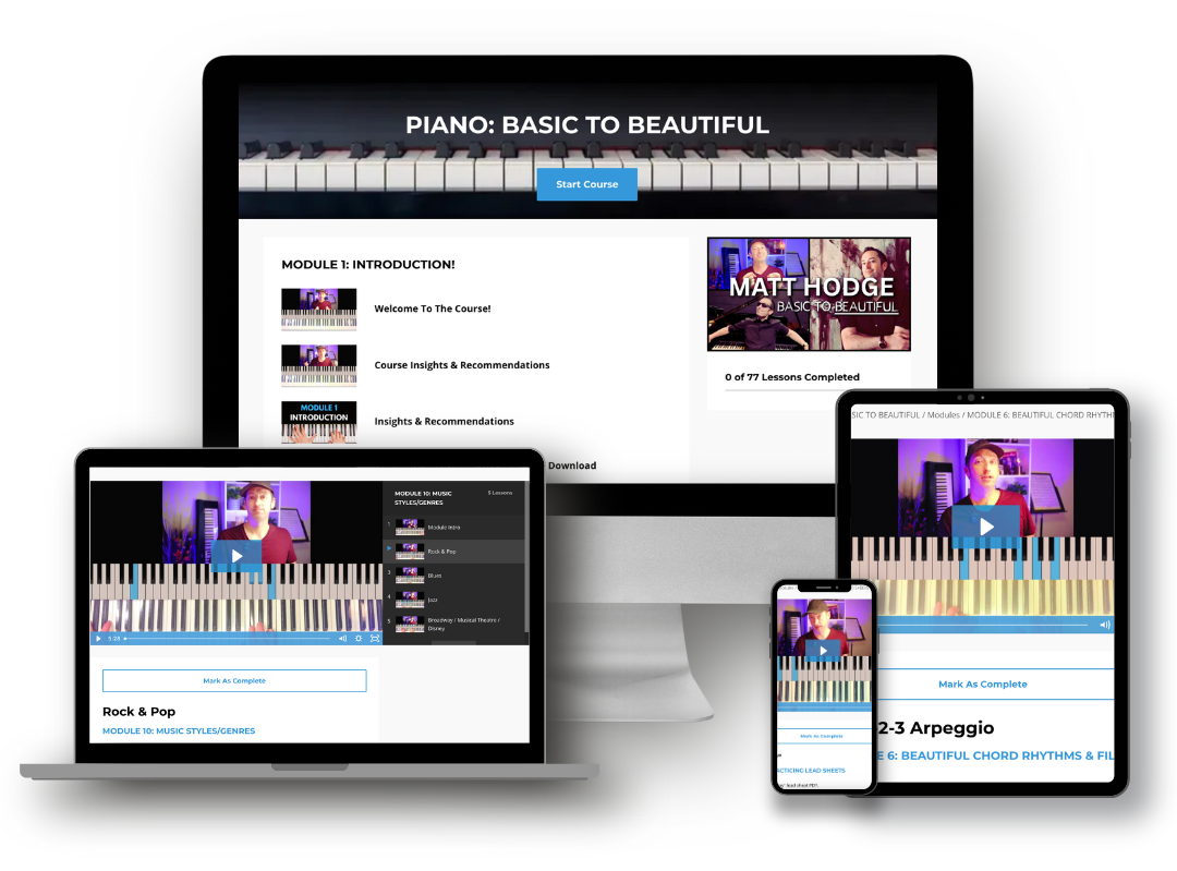 Always dreamed of learning how to play piano...but think it's too late for you? Well, stop dreaming and start playing! My comprehensive self-guided online program guides you step-by-step on a piano journey from complete beginner to beautiful player -- using my proven techniques as an award-winning professional pianist, music industry veteran, and music professor. With nearly 20 hours of interactive video lessons and song tutorials plus over 175 lead sheets to popular songs -- this transformative course will skyrocket you from a basic "beginner" to a "beautiful" piano player!